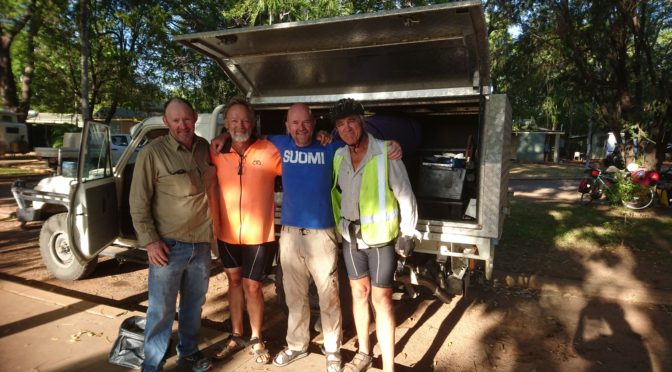 After some discussion about where to put the tents (a long term resident at the Kway Crossing Resort said ‘not too close to the fence because the locals on the way home from the pub hop over said fence to get resources to return to the pub) and then about where to drive the tent pegs (‘why did the office put tents here? Your tent pegs will puncture the irrigation pipes! Ahh well, stay and we’ll find the holes when you pack up your tent.’). Brother Peter and Rob pulled their camp out of the Land Cruiser. The surprise was Peter setting up in his daughter’s purple swag (a serious bush swag though) and her pink mosquito net.