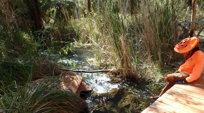 After lunch and a five km bike ride, Bruce and I rinsed off the dust off in Deep Reach pool of the Fortescue River before returning via the cliff top walk to camp. On the way we saw the patches of dead coolabah trees which, according to ranger Stu from Karijini NP, had died when erosion had cut through the natural bank damming the river in that location and which had provided a local underground shallow water table that the coolibah naturally grow on. When the natural dam broke, the water table disappeared and the coolibah died. Further up were stands of the natural Millstream Palm Livistona alfredii.