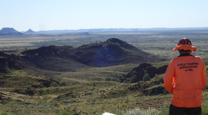 Climbing the 120m Chichester Range from Python Pool first thing in the morning was something I could have done without. Near the top Bruce stopped for a photo opportunity and we had some discussion as to whether or not the pyramid-shaped hill on the plain in the distance was Pyramid Hill Station (it was). Then it was picking our way back over the ten kms of rubbish corrugations to the Karratha Road turnoff and bitumen.