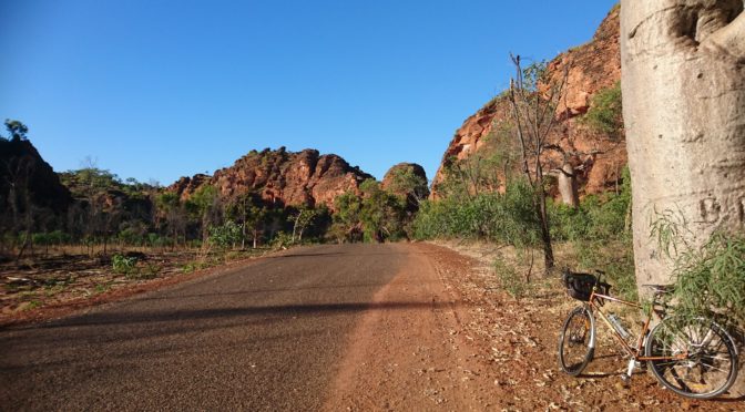 In the evening I rode out to the mini-Bungle Bungles (Mirima National Park) on the outskirts of Kununurra for a walk. Later the girls and I went to dinner at the Kununurra Country Club (quite up market) where Bruce joined us after his Argyle speedboat cruise.