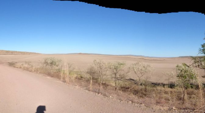 Up from the last beds in dongas that we’ll have for a week and on the road by about 9 am. We were all feeling good so the pace was brisk as the weather warmed in to the low-30s Celsius. Bruce was ever the non-conformist and headed out across the dried out mudflats rather than follow the road around the edge.