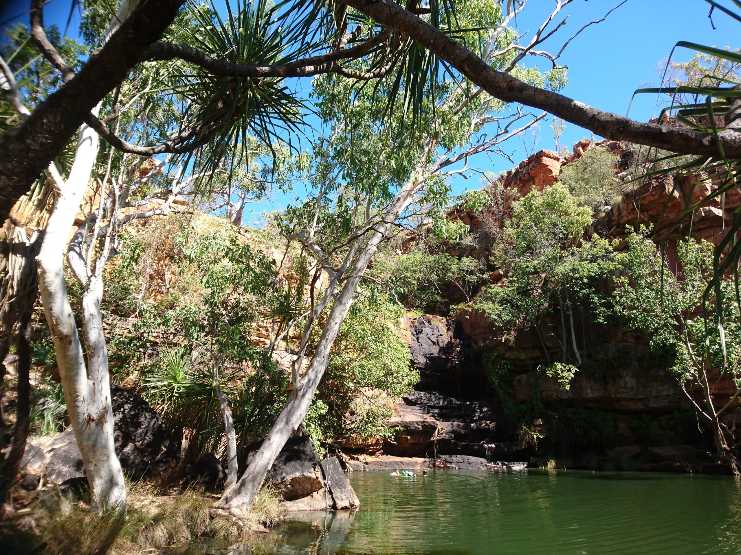 I pulled into the carpark for a bit of lunch and then walked/rode the 500 m in to the gorge itself for a look around and a swim. A young dad was herding and encouraging his young kids (6-8 year olds?) to swim to the waterfall and to get interested in the aboriginal rock art. Swim yes, rock art, no!
