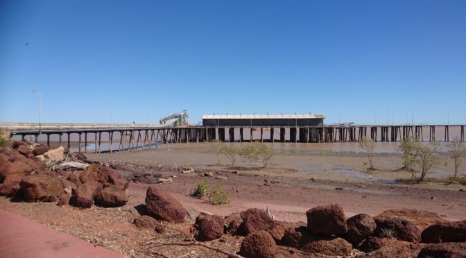 Starting the day with a ride out to the port. Disused cattle loading yards, disused mineral ore loading sheds and gantry and a closed cafe but a new picnic shed. As at Wyndham there is a huge tidal rise and fall at Derby to the extent that ships serving the port were specially designed to site on the mud at low tide which fortuitously gave enough time to unload/load the ship before the tide came in.