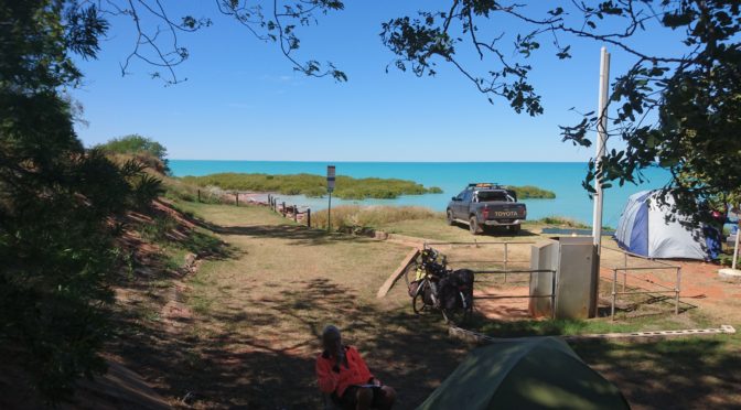 Bruce and I headed out into the headwind to meet Linda and Christine as they rode in from Roebuck Plains roadhouse. I blew up at about 10 kms and rested in a bus shelter, Bruce rode on to intercept the girls but never saw them. He eventually got to Roebuck Plains and checked his phone to find that they had pulled in to the Broome crocodile farm for morning coffee just when Bruce came past. We all rode back to Broome and set up in the caravan park.