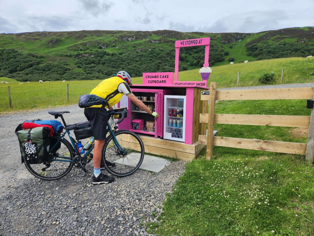 One significant stop of the day was at Betty Hill for coffee, lunch supplies and to call ScotRail to book trains back to London. The lady at ScotRail call centre was amazing. Over 36 minutes she got all four of us and our bikes onto the same train from Edinburgh to London. The problem started with the local Thurso to Inverness train not having room for all our bikes on Tuesday so she divided us up between trains on Wednesday to get us and bikes to Edinburgh then booked us and bikes all through to London. Great effort annomous call centre Scottish lady and greatly appreciated.