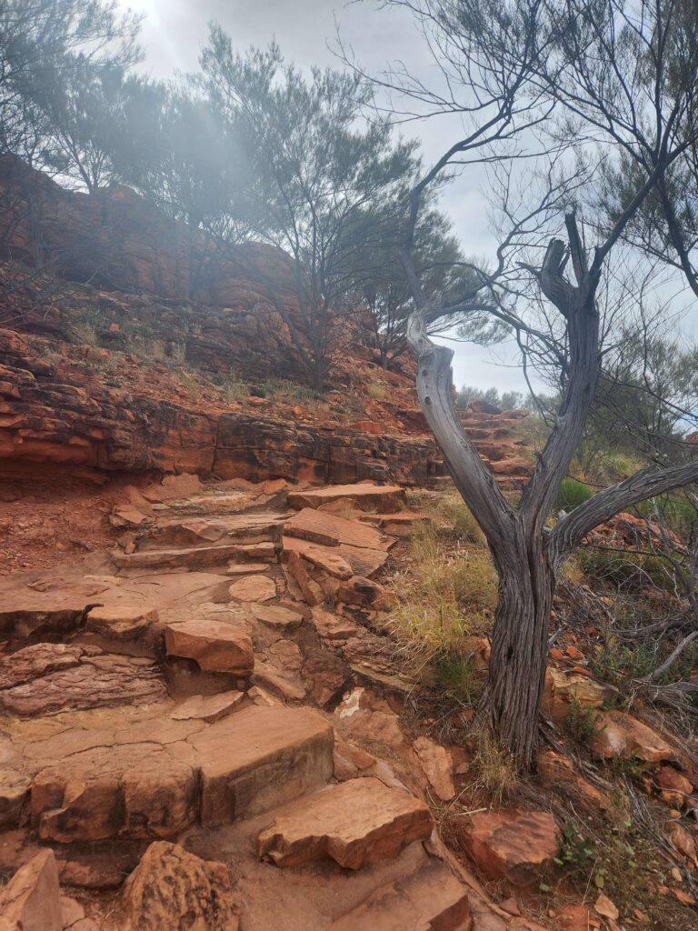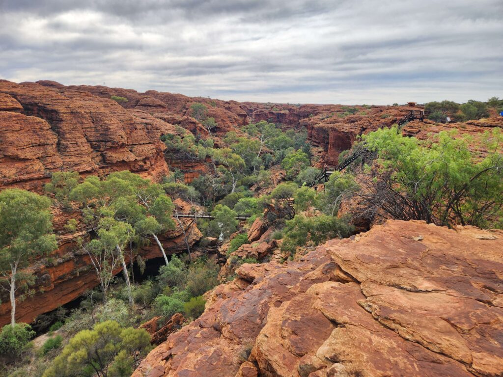 On for a strenuous 3 hour Rim Walk around Kings Canyon. Interesting enough, more for the fact that the deep Canyon has kept a climate constant enough for 20 million years to preserve some of the vegetation of the time as the landscape around turned to desert. Insure your ankles and knees with Lloyd’s of London before trying the rim.