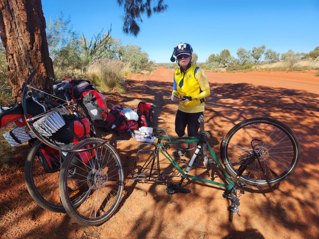 Intolerable was Christine’s wheel continually getting a warp in it as the spokes on the drive cog side kept coming loose. My theory is that the spokes had not been tightened properly when Condor Cycles built the bike in London before the 2024 LEJOG. The wheel held together on 2600km of British bitumen but 30km of Australian corrugations did it in.