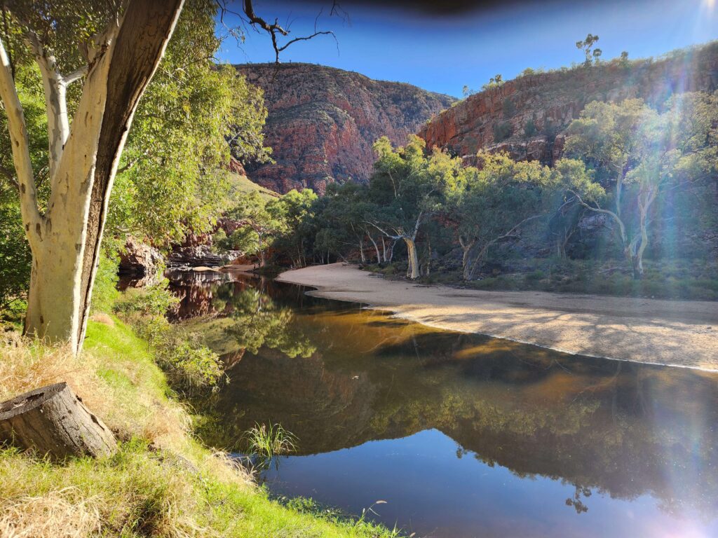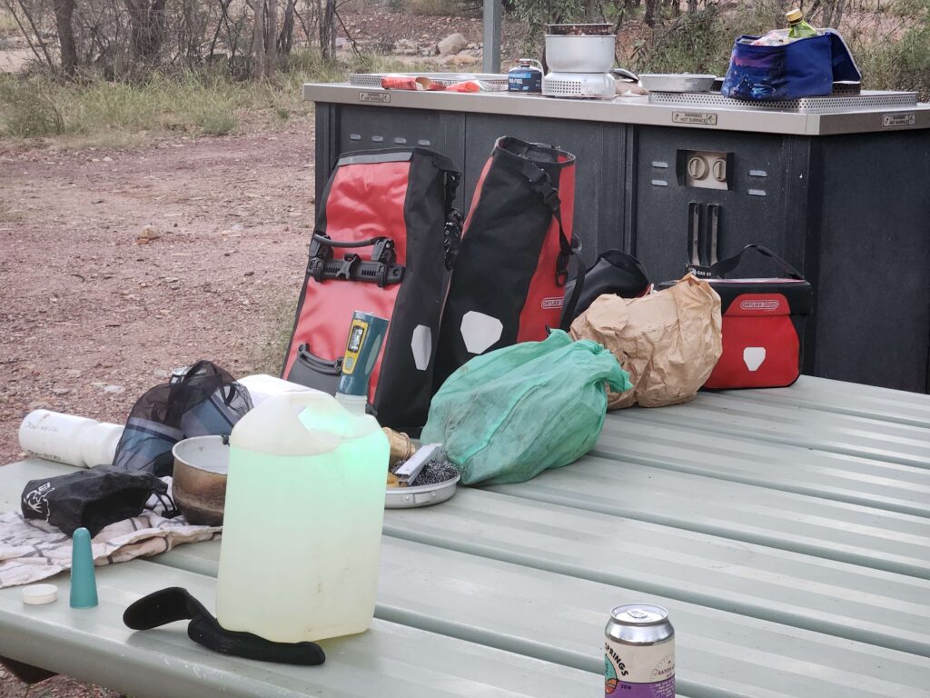 A shower! Of hot water, taps for fresh bore water. A kiosk for multiple bacon and egg toasties! Doesn’t get better than this. Except not having the ranger make you move camp just on dusk because we hadn’t booked a camp site days before (difficult when on bicycles on rough roads). Anyway we were directed to the tour bus camping area where a beer from a tour guide helped us feel better.