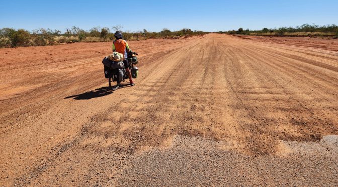 Usual late start (10am) as Don pfaffed around packing up even though he started about 7am. Almost 30km downwind run but then the bitumen ended. Moderately dusty and sandy with occasional good bits.