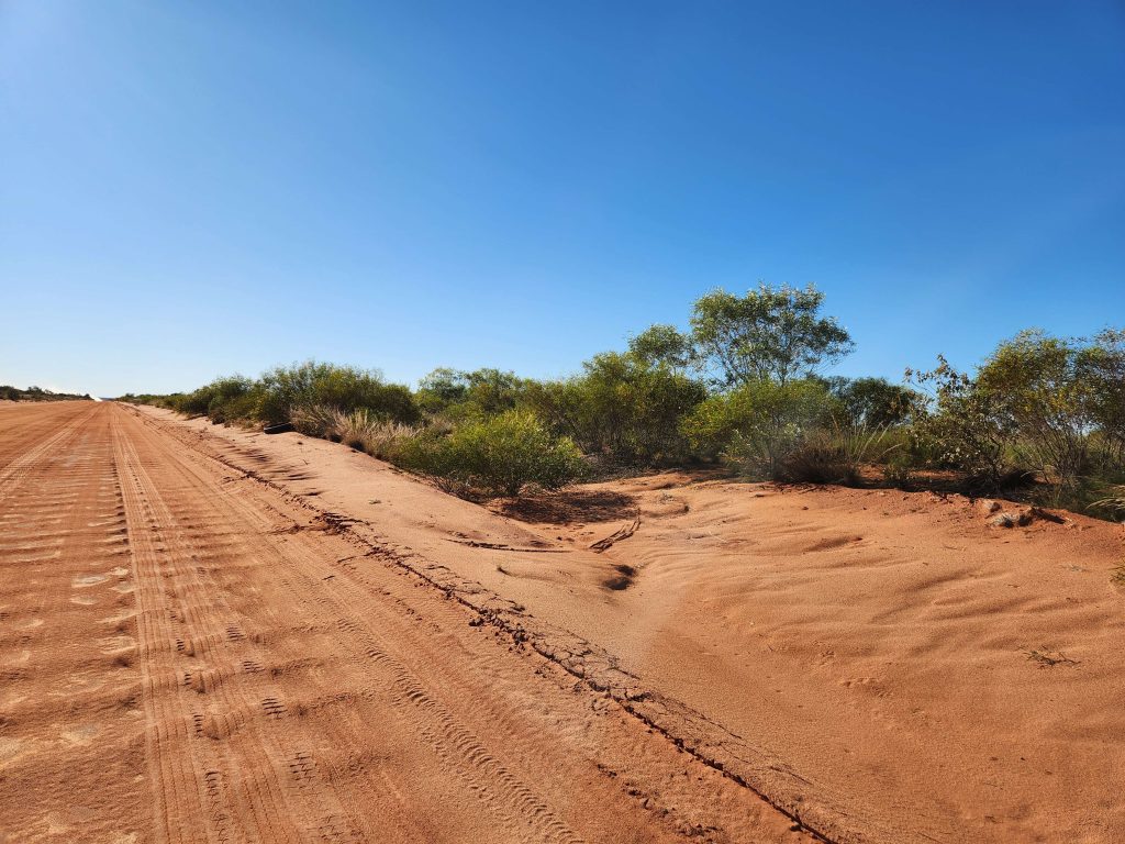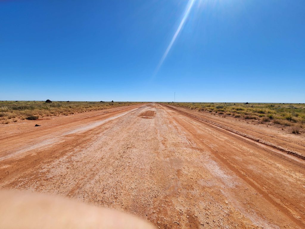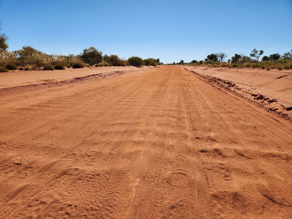 Road mosrtly dirt except for a 10km random stretch of bitumen. About 20km of it was loose sandy corrugations and slow riding. My first horizontal dismount in the sand on a particularly loose section. Nobody saw it so it never happened!