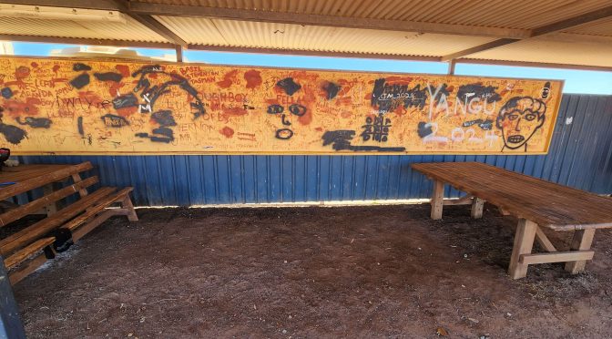 Spoke to a 40 something dreadlocks aborigine at The Granites. He was on his way back from wife’s country at Kalkaringe to his country at Alice Springs (he is Kowrowa from around The Plenty Highway). Nice chatting about white/black interactions and ‘sharing country’ as well as looking after country. Again his mob is critical of the Walpiri west of Alice Springs and Yuendumu (said the Walpiri are always after more money).