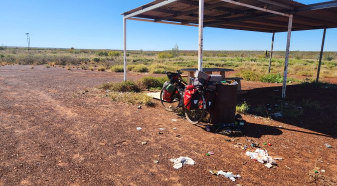 Crickets (no response) for two days and then today a southbound motorcyclist gave them to Don. He had been given them at Wolffe Creek Crater (driver at Tilmouth Well RH was given them by a south bound motorist but passed us going north before we got on the road one morning?) to ‘give to the cyclists still on the road to the south’. I nearly hugged the guy.