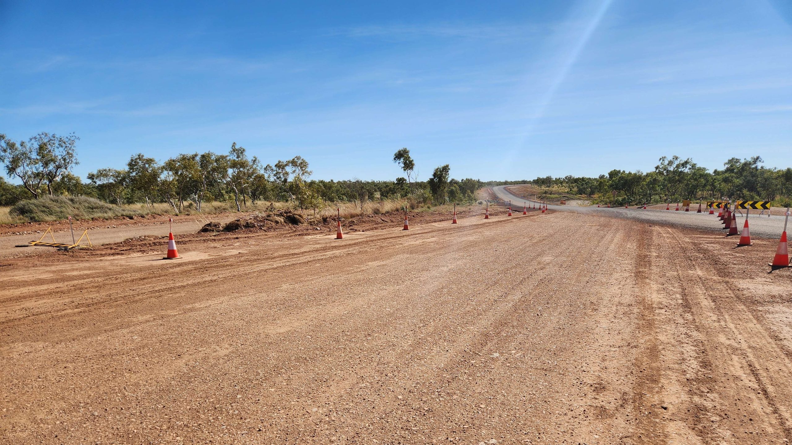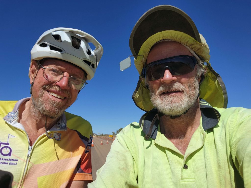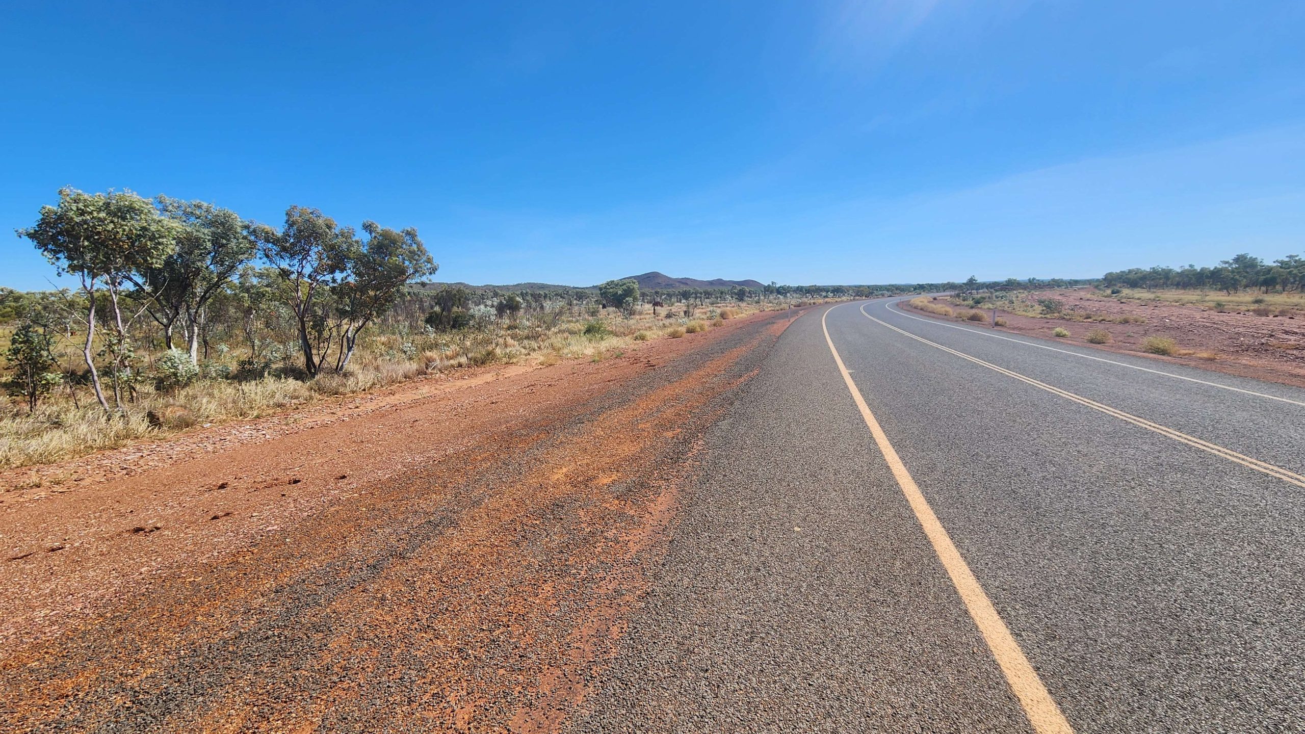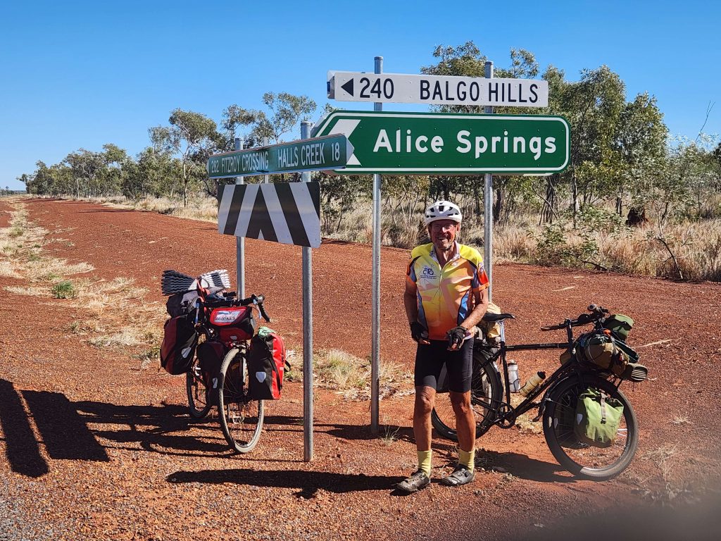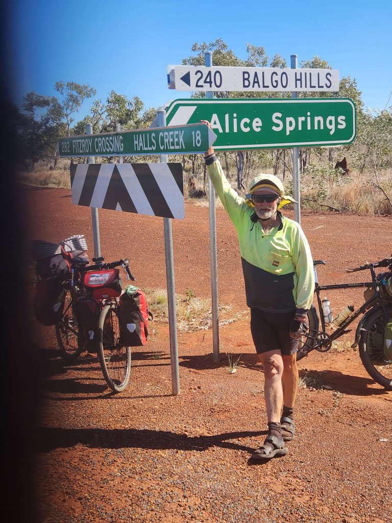 Made it to Halls Creek about 14:30. Last 18km into headwind but on the shoulder of Highway 1. Good road all day, first 14km on diversion road around new road then on 23km bitumen superhighway (gentle gradient, sweeping curves) to join Highway 1. A few photos of leaving the Tanami Road, two hours of pushing into headwind and we are in Halls Creek.