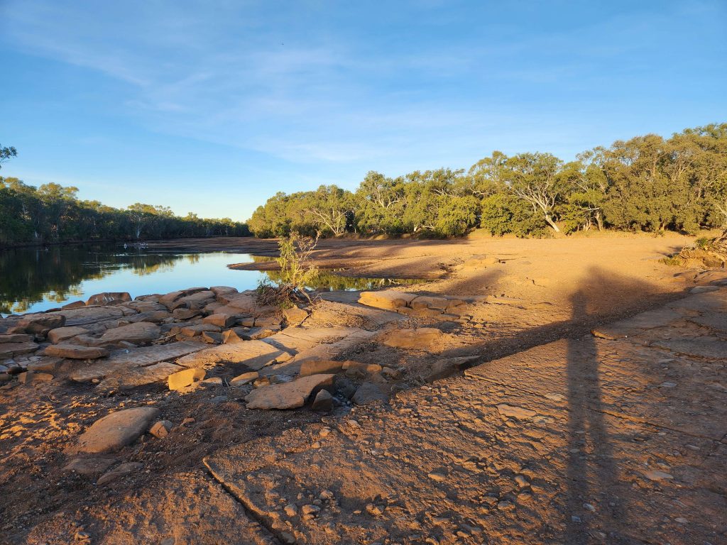 Moderately brisk easterly and fuelled legs pushed us to Mary River pool along with hundreds of grey nomad in caravans, by 4pm. Pool has new access road since 2002 but old causeway still there, just no road out from it. Remarkably, whereas in 2002 on my first ride across the top of Australia there only a few big old trees along the river pool, now there are lots of 150-200mm dbhob younger trees as well. That is quick natural regeneration. The old concrete causeway has also been replaced by a more robust culvert about a kilometre downriver.