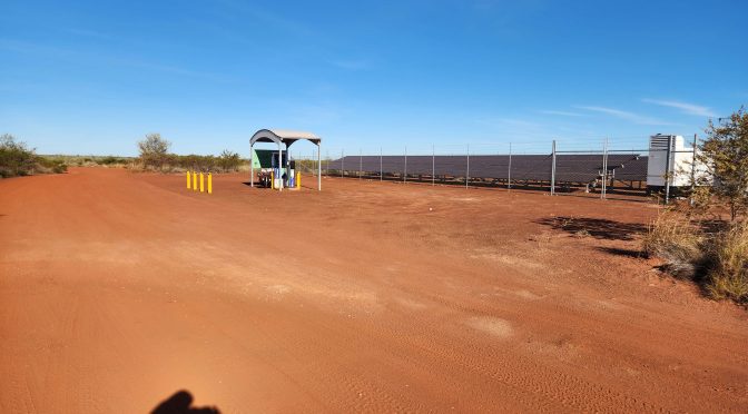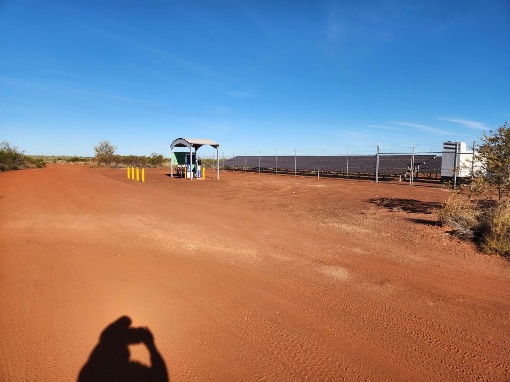 Got past the Ngumban Cliffs that we camped at all alone in 2002. The English man i was riding with on that section set off at night to beat the heat but got serious fright when snake got caught in his front wheel as he was freewheeling down the gap in the cliffs! No snakes this time but a new two stand electric car fast chargerPowered by looks like 100kW PV array with battery and diesel backup.