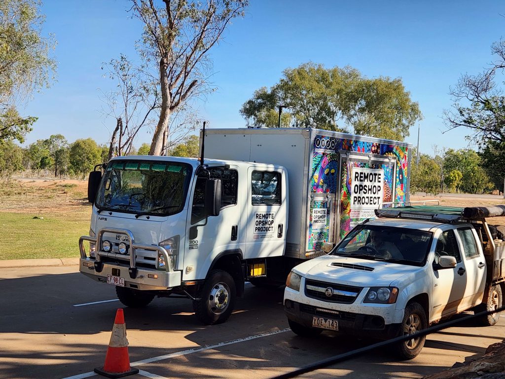 In Fitzroy Crossing Lodge by 13:00. Don had about few rests en route and got in around 14:30. A light truck in the check-in queue was a mobile clothing op shop providing cheap clothing to the outback communities. Although set up for camping the driver apparently thought a night with showers and restaurant beat another night in the bush.