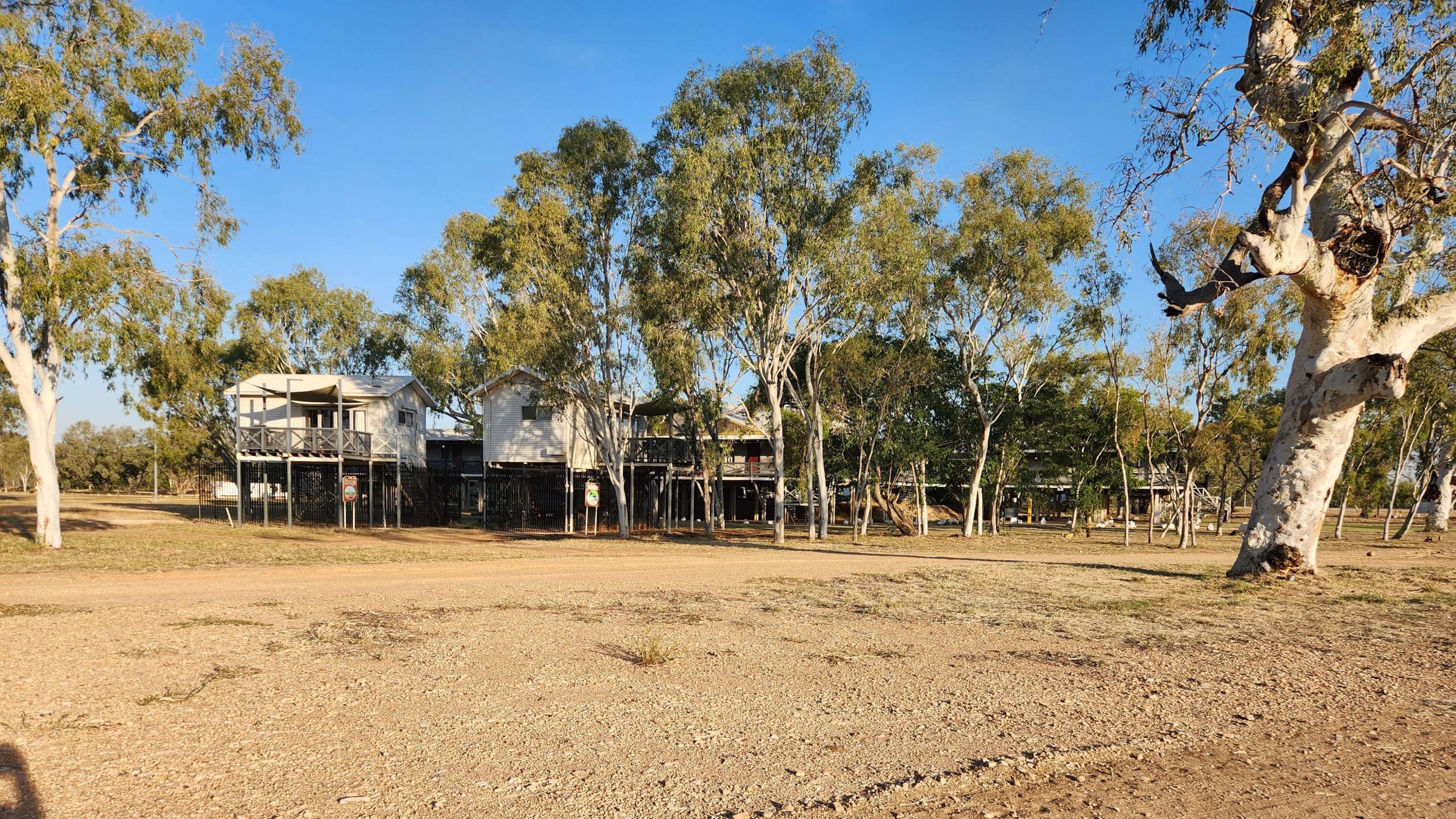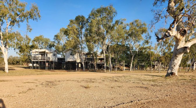 The Lodge combines fancy restaurant and rooms with large caravan park and big unpowered tenting area. All permanent buildings and shower blocks are on stilts or earth mounds at least 3m high. Presumably to get above the floods. Some aboriginal people behind the reception counter and the bar but all the grounds and cleaners seemed to be Torres Strait and Pacific Islanders.