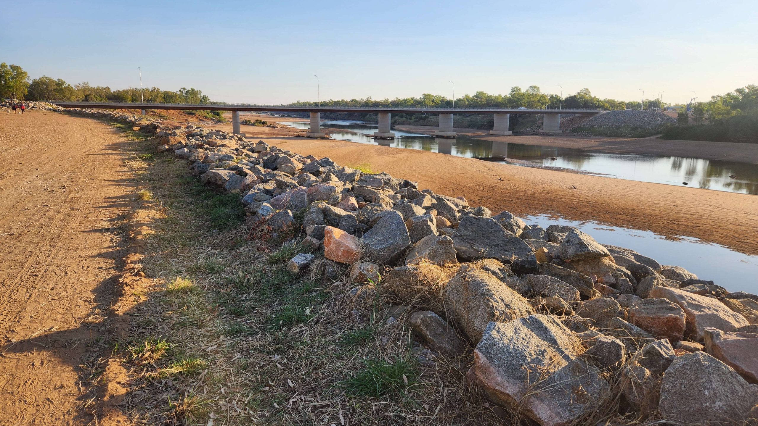 The Fitzroy Crossing bridge washed away in the flood but has been replaced, nearly a metre higher and with shear-bolts allowing the guard rails to collapse instead of catching debris and acting as a dam next time it floods.