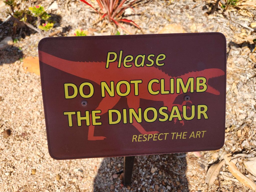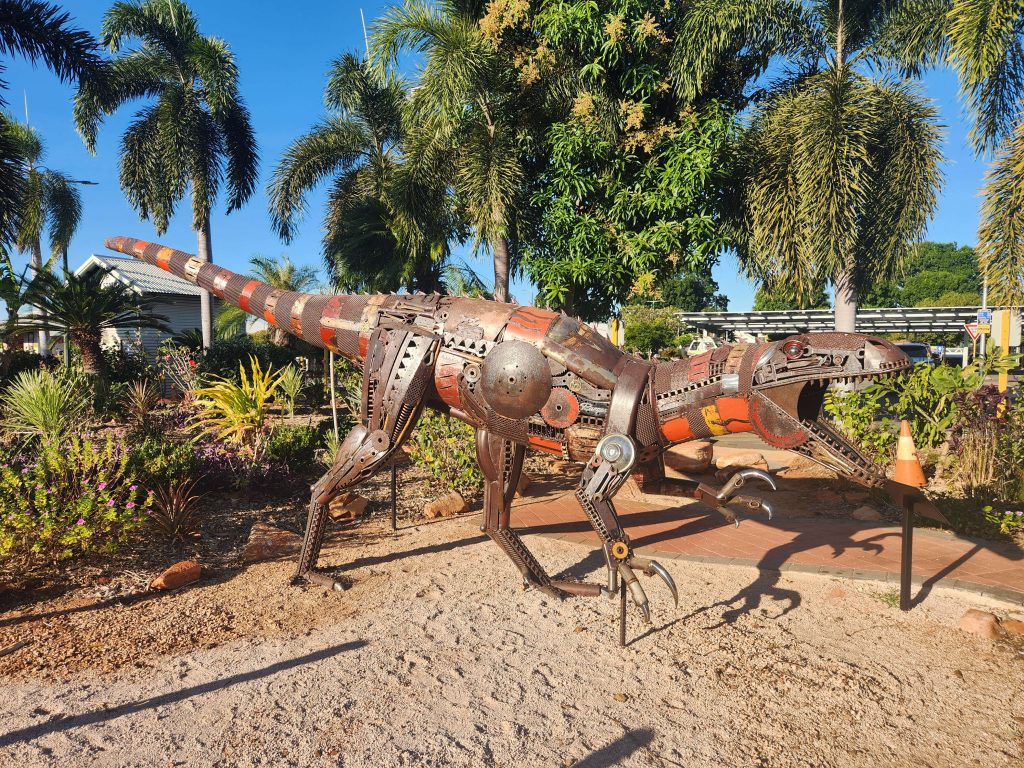A dinosaur in the carpark celebrates the dinosaur footprints common in this area even if it is a dinosaur from Winton in Qld.