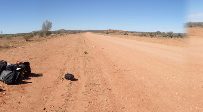 Out of the campground about 9:30 am, found the Finke Road and quickly left the bitumen behind. For the first kilometre or so followed wheel tracks that turned out to be someone pushing a baby carriage, probably from the Kulgera Station homestead.