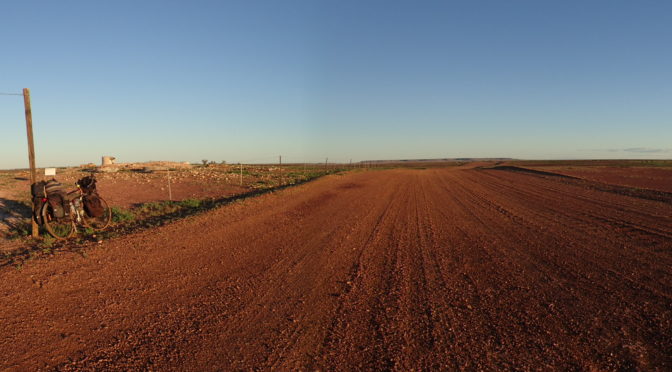 The road was interesting, especially in the southern part where part of the road ran next to a channel which may have been the eroded remains of the old road. The last 10 km of the day ran through flood-out country (dead flat, no real drainage channels) with eucalypt woodland. Pretty and surprizingly moist for the edge of the desert.