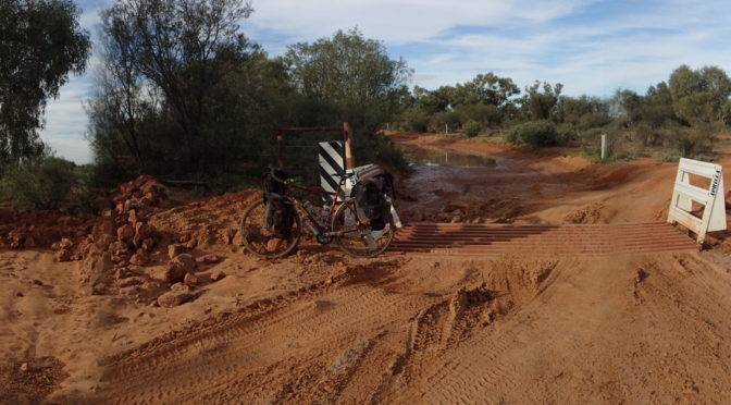 The last 8 km by the ‘Top Road’ to the boundary of the western Simpson Desert national park was on a shire road. The shire must have forgotten about it. It took nearly two hours to ride the 8 km over a track that was mostly gibbers from coin sized pebbles to head sized boulders. Utmost concentration and great physically effort was required. (note: at Willian Creek I met some guys who showed me a destroyed wheel off a 4WD, the driver was on this section of track but the road was so rough he hadn’t realised that he had blown a tyre let alone destroyed the rim).
