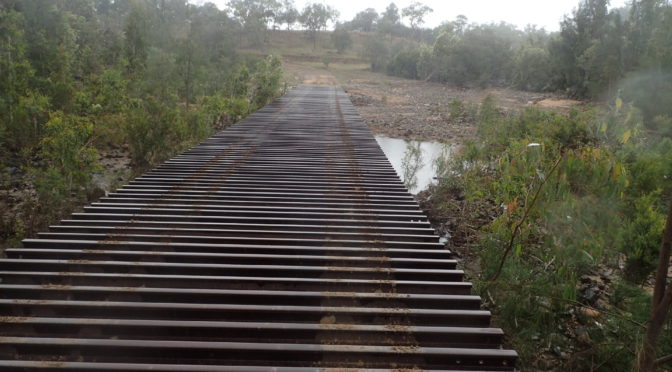 The Kangaroo Hills boundary is marked by a large creek and a fearsome ‘grid bridge’ – one slip and a leg drops between the bares and probably breaks. The iron rails are too slippery to ride. Get off and walk it, carefully.