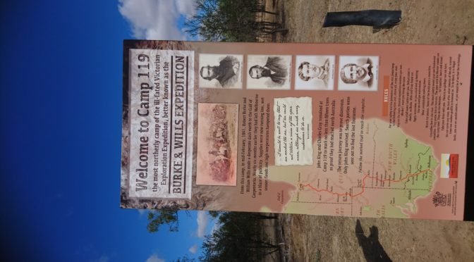 Before that we pushed out of Normanton about 10am and rode the tailwind at nearly 20km an hour for 40kms to Burke and Wills camp 119, the most northerly camp of their trip. Nice explanation signs about what went on as B&W made the last dash to the gulf.