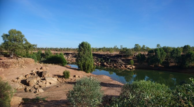 I weakened during the day and finally ran completely out of energy after the last river crossing 2kms short of Leichhardt’s Falls. After half an hour cooling down in the shade of the Burketown roadsign (while everyone else waited for me) got enough energy to ride through the last 2km to the falls. Not flowing.
