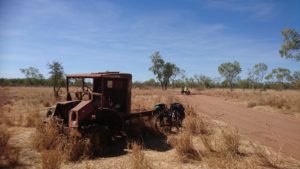The corrugations disappeared as soon as we headed north through Lawn Hill station. Across the (flowing mid-shin deep) Lawn Hill Creek crossings and on to the blacksoil plains. Nice firrm road but the slightly rough clay peds making the road were tiring to rattle over. Through a few dry gullies, met the maitre d’ from the Lawn Hill restaurant who said to camp at Elizabeth Creek at 60 km along. Only surface water near the road although road parallels a major Creek for many kms).